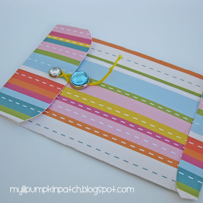 I decided to make a clasp closure envelope, so after gluing the envelope, I punched a couple of small holes in the envelope. Then, I added some rhinestone brads. Thread some floss through the hole in the flap before inserting the brad and wrap the end around the closed brad to secure it in place.